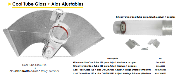 - Cool Tube Glass + Alas ORIGINALES Adjust-A-Wings Enforcer / Medium: Un sistema completo que combina la eficiencia del Cool Tube con la capacidad de reflexión y ajuste superior de las alas Adjust-A-Wings ofreciendo una distribución lumínica excepcional y un control térmico óptimo. También disponible en diferentes longitudes (125mm y 150mm).