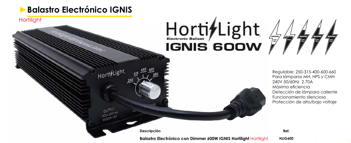 Para los cultivadores de CBD medicinal que buscan un control preciso y una eficiencia superior en su sistema de iluminación. El Balastro Electrónico IGNIS 600W de Hortilight con Dimmer representa una solución de vanguardia. Este balastro digital y regulable ofrece una gestión inteligente de la potencia lumínica optimizando el crecimiento de tus plantas en cada etapa y garantizando un rendimiento excepcional.