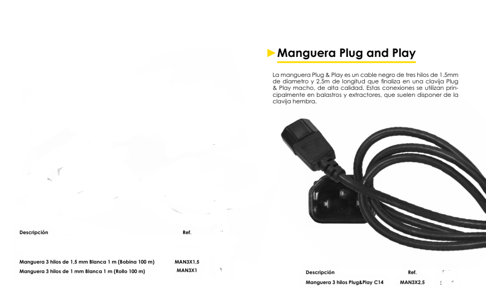 La Manguera Plug & Play es un cable negro de alta calidad con tres hilos de 1.5mm de diámetro y 2.5 metros de longitud diseñado para ofrecer una conexión eléctrica rápida, segura y confiable para tus equipos de cultivo de CBD medicinal. Finaliza en una clavija macho Plug & Play C14, un estándar comúnmente utilizado en balastros electrónicos y extractores que suelen disponer de la clavija hembra correspondiente.