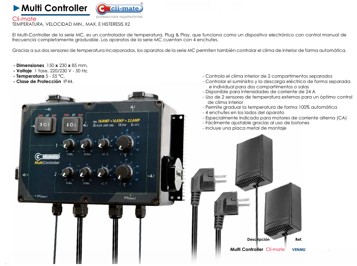 El Multi Controller de Cli-mate es un controlador electrónico avanzado diseñado con tecnología "Plug & Play" para una gestión climática totalmente graduable y automática en tu cultivo de CBD medicinal. Equipado con cuatro enchufes y dos sensores de temperatura incorporados. Este dispositivo te permite controlar de forma independiente el clima de dos compartimentos o salas diferentes ofreciendo un control preciso de la temperatura, la velocidad mínima, la velocidad máxima y la histéresis.