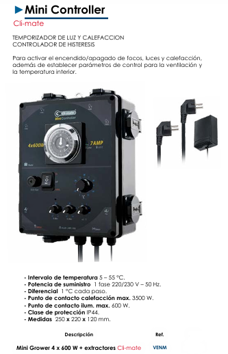 El Mini Controller de Cli-mate es un dispositivo compacto y versátil diseñado para controlar el encendido/apagado de focos, luces y calefacción en tu cultivo de CBD medicinal. Además, te permite establecer parámetros de control para la ventilación (en función de la temperatura) y la histéresis asegurando un ambiente óptimo para tus plantas.