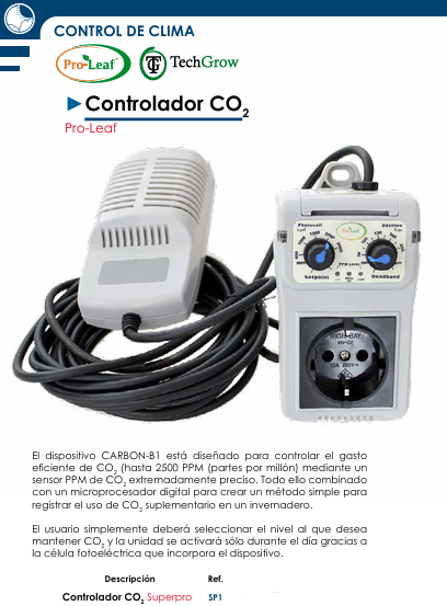 El dispositivo CARBON-B1 de Pro-Leaf está diseñado para controlar el suministro de CO₂ (hasta 2500 PPM - partes por millón) en tu invernadero de CBD medicinal de manera eficiente y precisa. Utiliza un sensor de CO₂ de alta exactitud combinado con un microprocesador digital para ofrecer un método simple y fiable para registrar el uso de CO₂ suplementario.