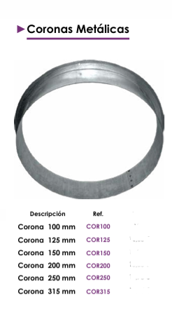 - Disponibilidad en Diversos Diámetros: Ofrecemos Coronas Metálicas en una variedad de tamaños (100 mm, 125 mm, 150 mm, 200 mm, 250 mm y 315 mm) para adaptarse a tus diferentes necesidades de conexión.