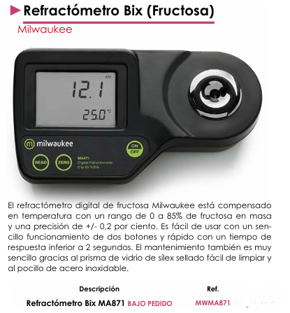 - Medición digital precisa de fructosa: Ofrece lecturas exactas en un rango de 0 a 85% de fructosa en masa.