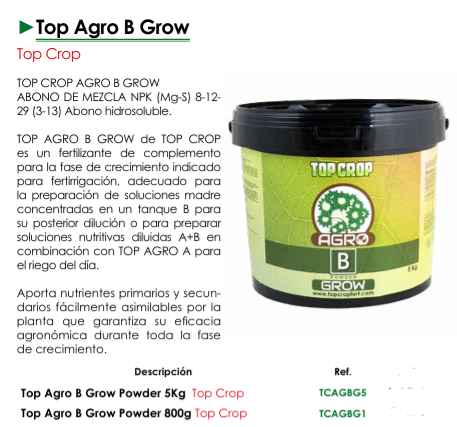 - Nitrógeno y Fósforo Equilibrados para un Crecimiento Óptimo: La proporción equilibrada de nitrógeno y fósforo en Top Agro B Grow favorece tanto el desarrollo foliar como el radicular asegurando una planta sana y preparada para la siguiente fase de floración.