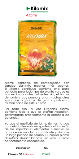 Su fórmula superior incluye una generosa cantidad de humus de lombriz, cal, guano y otras sustancias orgánicas de gran importancia que en conjunto forman un sustrato excepcionalmente enriquecido. Kilomix ha sido cuidadosamente elaborado para proporcionar a tus plantas todo lo que necesitan prácticamente garantizando la ausencia de carencias nutricionales durante su ciclo de vida.