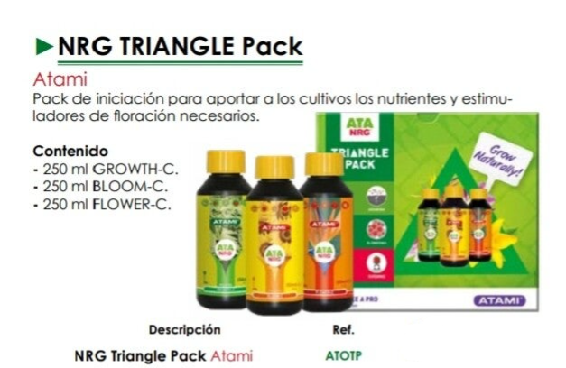 NRG TRIANGLE Pack de Atami es el kit de iniciación perfecto para cultivadores que buscan una solución sencilla y eficaz para aportar a sus cultivos los nutrientes y estimuladores de floración necesarios con un enfoque en el crecimiento natural y la obtención de resultados sabrosos y aromáticos. Este pack reúne tres productos clave de la línea NRG de Atami diseñados para trabajar en armonía durante las fases de crecimiento y floración.