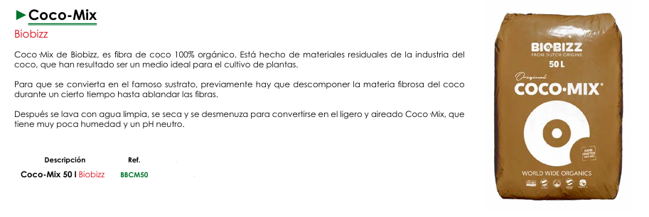 Biobizz Coco-Mix te ofrece un medio de cultivo versátil, limpio y con una estructura ideal para un crecimiento radicular excepcional. Combinado con los nutrientes adecuados te permitirá obtener cosechas abundantes y de alta calidad.