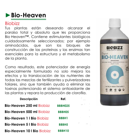 Regala a tus plantas un viaje al paraíso del crecimiento con Bio-Heaven Biobizz ya que es un potente estimulador energético diseñado para optimizar la absorción de nutrientes, eliminar toxinas y revitalizar tus cultivos en todas las etapas de su desarrollo.