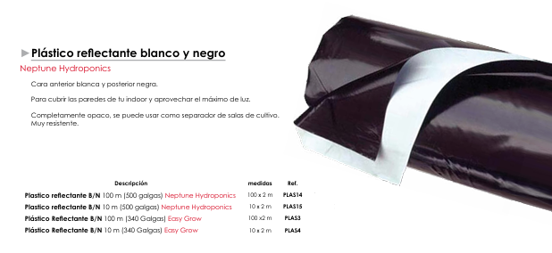 - Plástico reflectante B/N 10 m (500 galgas) Neptune Hydroponics: Ideal para proyectos pequeños o para cubrir áreas específicas con mayor grosor.