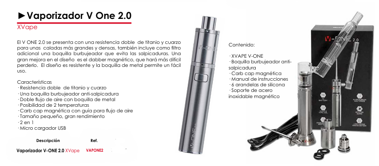 - Tamaño Pequeño, Gran Rendimiento: A pesar de su diseño compacto y portátil, el V One 2.0 ofrece un rendimiento excepcional en cuanto a producción de vapor y sabor.