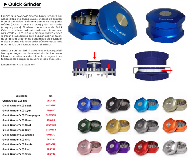 Ofrece a tus clientes la última innovación en grinders con el Quick Grinder V.03. Este grinder de diseño patentado revoluciona la experiencia de triturado gracias a su sistema único de expulsión automática que facilita la obtención del material perfectamente picado sin necesidad de manipularlo.