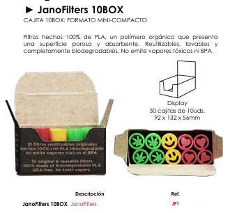 Ofrece a tus clientes una alternativa ecológica y divertida a los filtros convencionales con los JanoFilters 10BOX. Estos filtros mini-compactos están fabricados 100% con PLA que es un polímero orgánico poroso y absorbente que no emite vapores tóxicos ni BPA. Reutilizables, lavables y completamente biodegradables vienen en cajas de 10 unidades con diseños originales y coloridos.
