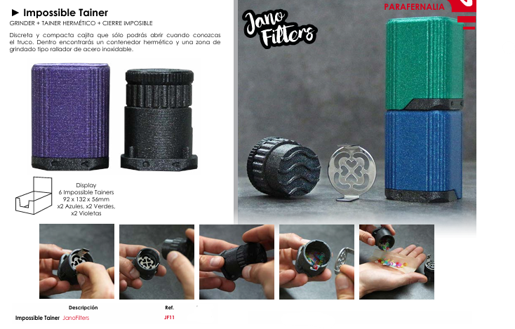 Disponible en una combinación de colores atractiva (2 azules y 2 violetas por display). El Impossible Tainer añade un toque de estilo a tu rutina. Su presentación en un display de 6 unidades lo convierte en un producto atractivo para tu grow shop ofreciendo a tus clientes una solución única y sorprendente.