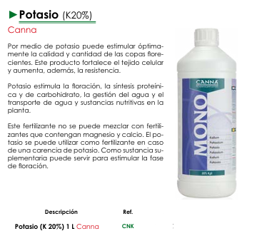 Si buscas maximizar la calidad y cantidad de tus cogollos, fortalecer tus plantas y asegurar una floración exitosa. El Canna Mono Potasio (K 20%) es un nutriente esencial para tu programa de cultivo especialmente durante la fase de floración.