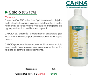 Si buscas asegurar tejidos fuertes, un crecimiento equilibrado y una mayor resistencia en tus plantas. Canna Mono Calcio (Ca 15%) es un nutriente fundamental para tu programa de cultivo.