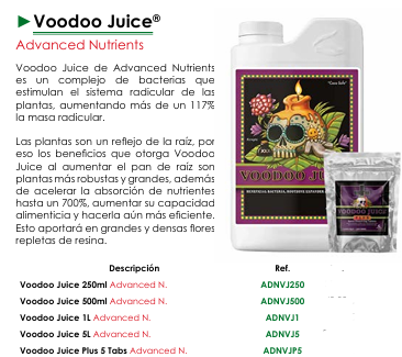 Si buscas un crecimiento radicular explosivo, una absorción de nutrientes optimizada y cosechas espectaculares. Voodoo Juice® de Advanced Nutrients es el estimulador radicular que necesitas para llevar tu cultivo al siguiente nivel.