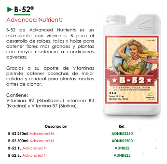 Si buscas un estimulante vitamínico potente para fortalecer tus plantas desde la raíz, promover un crecimiento vigoroso y aumentar su resistencia al estrés. B-52® de Advanced Nutrients es la elección perfecta para asegurar cosechas de calidad superior.