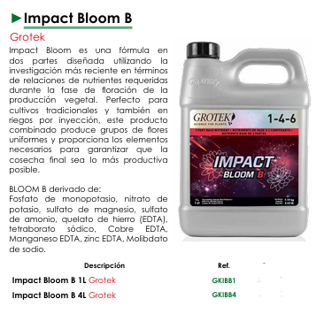 Impact Bloom B está disponible en presentaciones de 1 Litro (Ref. GKIBB1) y 4 Litros (Ref. GKIBB4) adaptándose a las necesidades de cultivadores de todos los tamaños.