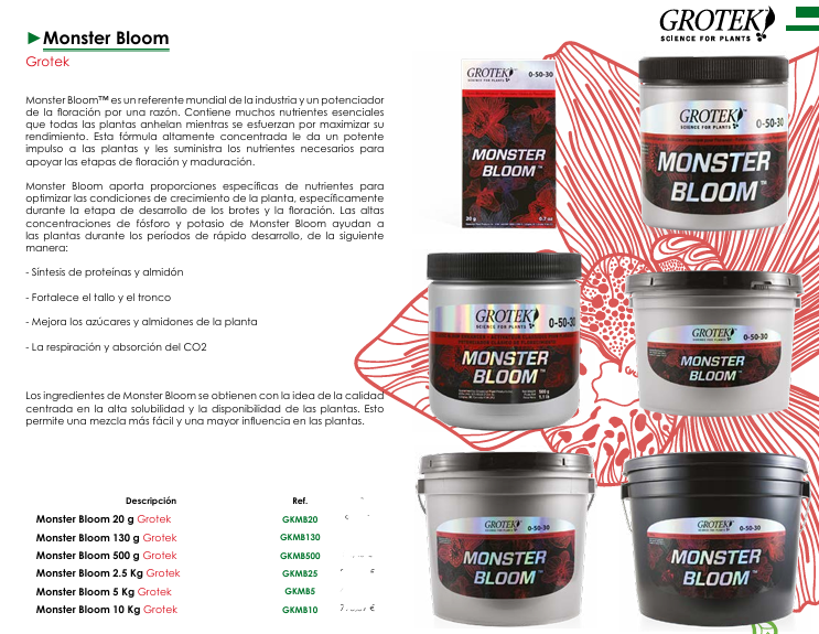 - Monster Bloom 20 g (Ref. GKMB20): Ideal para pruebas o cultivos muy pequeños.