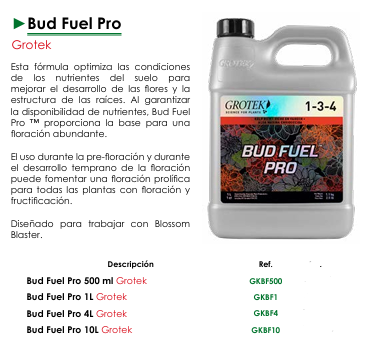 Bud Fuel Pro ha sido específicamente diseñado para trabajar en sinergia con Blossom Blaster de Grotek. La combinación de ambos productos proporciona un impulso aún mayor a la floración maximizando el número de flores, su tamaño y la calidad final de la cosecha.