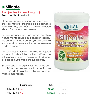 - Silicate 1 Litro T.A. (Ref. GHMM): Ideal para cultivadores con un número reducido de plantas o para probar sus beneficios.