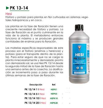 - PK 13/14 1 Litro Hesi (Ref. HEPK1): Ideal para pequeños cultivadores o para probar el producto.