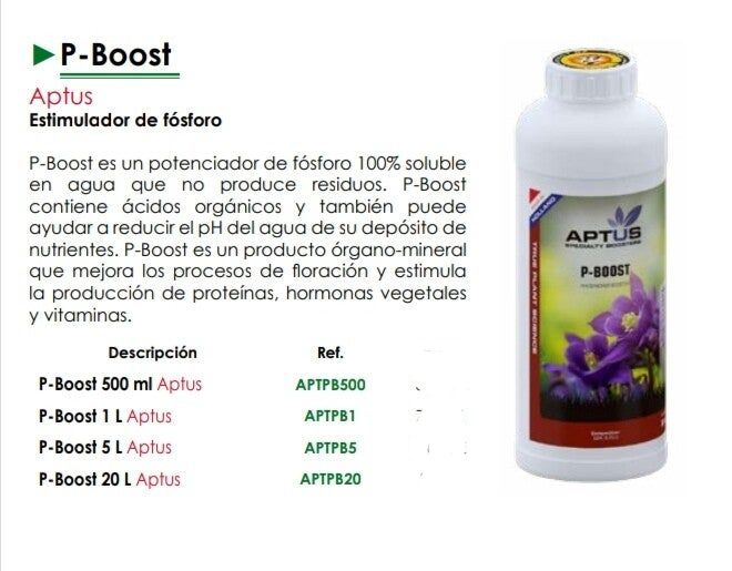 P-Boost de Aptus es un potenciador de fósforo 100% soluble en agua diseñado para optimizar la fase de floración de tus plantas sin dejar residuos. Su fórmula única está enriquecida con ácidos orgánicos no solo proporciona una fuente de fósforo altamente asimilable sino que también ayuda a reducir el pH de tu solución nutritiva mejorando la absorción general de nutrientes.