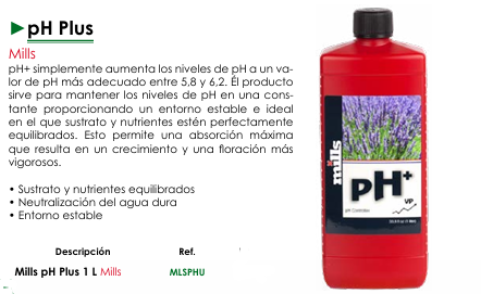 pH Plus de Mills es una solución concentrada por lo que debe añadirse gradualmente a la solución nutritiva y verificarse el pH con un medidor confiable después de cada adición.