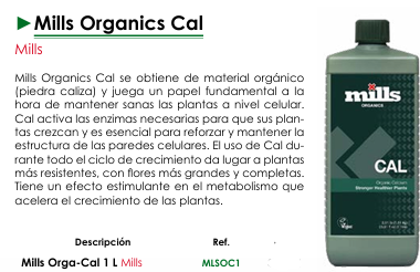 - Compatibilidad: Mills Organics Cal es compatible con otros nutrientes y aditivos orgánicos de la gama Mills obteniendo crear un programa de nutrición completo y equilibrado.