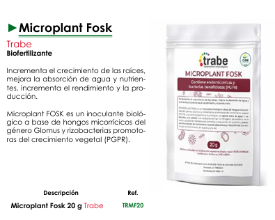 Descubre Microplant Fosk de Trabe es un inoculante biológico avanzado a base de hongos micorrícicos del género Glomus y rizobacterias promotoras del crecimiento vegetal (PGPR). Este potente biofertilizante está diseñado para incrementar el crecimiento de las raíces, mejorar significativamente la absorción de agua y nutrientes esenciales aumentando el rendimiento y la producción de tus cultivos de manera natural y sostenible.