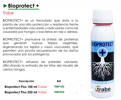 Descubre Bioprotect + de Trabe, un formulado innovador diseñado para dotar a tus plantas de una alta protección y resistencia frente a una amplia gama de enfermedades vasculares y radiculares tanto las causadas por hongos como por bacterias ya sean en la raíz o en las partes aéreas. Bioprotect + va más allá de la simple protección. Promueve activamente la síntesis de proteínas esenciales para la generación de nuevos tejidos vegetales, regenerando los tejidos y vasos vasculares dañados por los patógenos permitiendo una pronta recuperación de los daños sufridos. Además, Bioprotect + refuerza las paredes celulares de las plantas, creando una barrera física que dificulta la entrada de las hifas del micelio de ciertos hongos proporcionando una defensa integral y duradera.