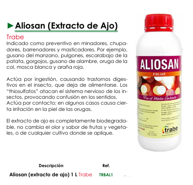 Descubre Aliosan (Extracto de Ajo) de Trabe es una solución natural y eficaz para la prevención y el control de una amplia gama de plagas en tus cultivos. Indicado como preventivo y curativo contra minadores, chupadores (como pulgones y mosca blanca), barrenadores, masticadores (como el gusano del manzano y el escarabajo de la patata), gorgojos, gusano de alambre, oruga de la col y la molesta araña roja. Aliosan aprovecha el poder repelente y las propiedades insecticidas del extracto de ajo para proteger tus plantas de forma segura y sostenible.