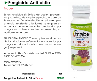Descubre el Fungicida Anti-oidio de Trabe es una solución sistémica de última generación con acción tanto preventiva como curativa estando diseñada para ofrecer una protección eficaz y duradera contra una amplia gama de hongos que afectan a tus cultivos y plantas ornamentales. Formulado a base de Tetraconazol al 12,5% p/v destacando por su alta efectividad y buena persistencia, incluso en condiciones de lluvia. Especialmente indicado para el control del oídio siendo eficaz contra otras enfermedades fúngicas importantes como la antracnosis (mancha negra) y la roya asegurando la salud y la belleza de tus plantas en particular las delicadas rosas.