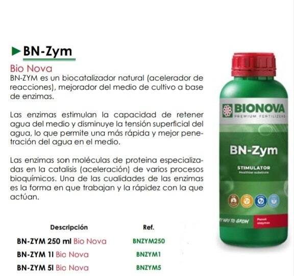 - BN-Zym 250 ml Bio Nova (Ref. BNZYM250): Perfecto para cultivadores domésticos o para probar los beneficios de BN-Zym en un número limitado de plantas.