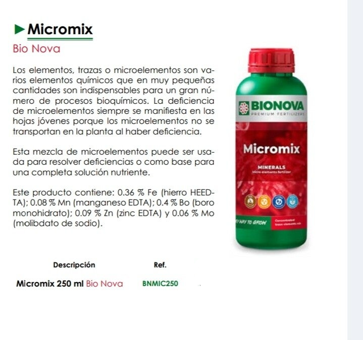 - Micromix 250 ml Bio Nova (Ref. BNMIC250): Ideal para cultivadores domésticos o para tener a mano como solución para posibles deficiencias.