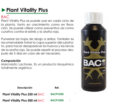 Plant Vitality Plus de BAC es un producto bioquímico totalmente orgánico que puedes utilizar en cada etapa del ciclo de vida de tus plantas tanto en crecimiento como en floración. Su versatilidad lo convierte en una herramienta esencial para la prevención y el tratamiento contra el estrés y la molesta araña roja. Fortalece tus plantas de forma natural y asegura un crecimiento saludable y vigoroso.