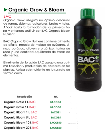 - Organic Grow (Crecimiento): Utilizar durante la fase vegetativa hasta la formación de las primeras flores. Seguir las indicaciones de la tabla de cultivo de BAC para la dosis específica según la etapa de crecimiento.