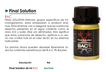 - Método: Sustituir la solución nutritiva habitual por Final Solution BAC. Regar las plantas con esta solución según tu rutina de riego normal. No añadir ningún otro nutriente durante este periodo.
