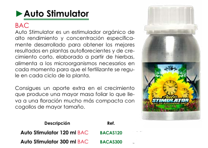 Potencia el crecimiento y la floración de tus plantas autoflorecientes al máximo nivel con Auto Stimulator de BAC. Su fórmula orgánica y su acción específica en la microvida del sustrato aseguran una absorción eficiente de nutrientes y un rendimiento espectacular en el corto ciclo de vida de tus autos.