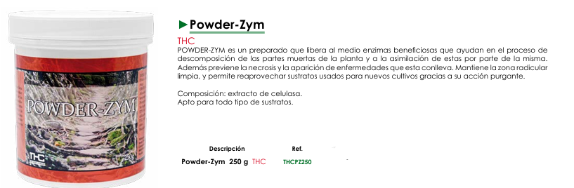 Descubre Powder-Zym de THC que es un preparado enzimático que libera una potente acción limpiadora y regeneradora en tu sustrato. Este producto esencial ayuda en la descomposición de las partes muertas de la planta facilitando su asimilación y previniendo la aparición de enfermedades relacionadas con la acumulación de materia orgánica en descomposición. Además, su acción purificante mantiene la zona radicular limpia y permite reutilizar sustratos usados para nuevos cultivos.