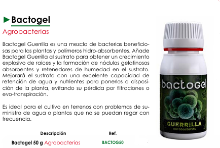 Descubre Bactogel Guerrilla de Agrobacterias ya que es una mezcla innovadora de bacterias beneficiosas para las plantas y polímeros hidro-absorbentes está diseñada especialmente para cultivos en terrenos con problemas de suministro de agua o para plantas que no se pueden regar con frecuencia. Este gel inteligente se añade al sustrato para lograr un crecimiento explosivo de raíces y la formación de nódulos gelatinosos que absorben y retienen la humedad mejorando la capacidad del sustrato para poner agua y nutrientes a disposición de la planta evitando su pérdida por filtraciones o evapotranspiración.