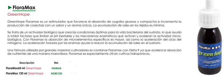 Descubre FloraMax de GreenHope ya que es un estimulador diseñado para favorecer el desarrollo de cogollos gruesos y compactos incrementando la producción de cosechas con un sabor y un aroma únicos. Este activador biológico crea las condiciones óptimas para la vida bacteriana beneficiosa del sustrato ayudando a inhibir factores que limitan el pH inestable y los mecanismos enzimáticos que activan y aceleran la actividad microbiológica. Con FloraMax la absorción de microelementos específicos es mayor así como la aceleración del ciclo del nitrógeno. La aceleración forzada por las enzimas ayuda a reducir la acumulación de sales en el sustrato resultando en una acumulación mínima de sales en los tejidos de la planta.