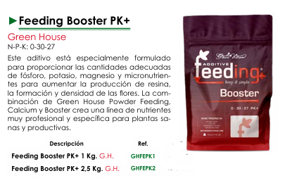Descubre Feeding Booster PK+ de Green House ya que es un aditivo especialmente formulado para proporcionar las cantidades adecuadas de fósforo, potasio, magnesio y micronutrientes esenciales para maximizar la producción de resina, la formación y la densidad de las flores. Su fórmula NPK 0-30-27 está diseñada para potenciar la etapa final de la floración asegurando cogollos pesados, resinosos y de la más alta calidad. La combinación de Green House Powder Feeding, Calcium y Booster PK+ crea una línea de nutrientes muy profesional y específica para plantas sanas y productivas.