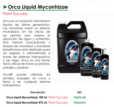 Descubre Orca de Plant Success ya que es un producto microbiano líquido de última generación diseñado para revolucionar la salud y el rendimiento de tus plantas. Orca establece una potente simbiosis microbiana en las raíces mejorando drásticamente la absorción de agua y nutrientes esenciales. Esta mezcla concentrada y diversa de micorrizas y bacterias beneficiosas está especialmente diseñada para ser regada o administrada a través de sistemas hidropónicos o de riego tradicionales. Orca es una forma fácil y eficaz de tratar tus semillas, esquejes y de revitalizar plantas en coco, tierra o cualquier sistema hidropónico promoviendo un crecimiento vigoroso y cosechas abundantes.