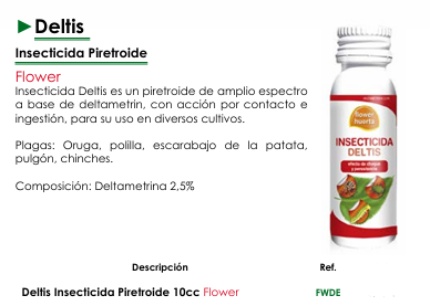No permitas que las plagas dañen tus cosechas y plantas. Con Deltis Insecticida Piretroide Flower tienes a tu disposición un insecticida de amplio espectro y doble acción que te ayudará a mantener tus cultivos protegidos de una gran variedad de invasores asegurando su salud y productividad.