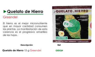 Descubre el Quelato de Hierro de Greendel que es un micronutriente esencial que tus plantas necesitan en gran cantidad para un desarrollo saludable. La carencia de hierro se manifiesta en un progresivo amarilleamiento de las hojas conocido como clorosis férrica. El Quelato de Hierro de Greendel es la respuesta rápida y eficaz para corregir esta deficiencia devolviendo a tus plantas su característico color verde intenso y promoviendo un crecimiento vigoroso. Su formulación especial asegura una absorción rápida y eficiente por parte de la planta ofreciendo resultados visibles en poco tiempo.