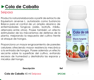 Descubre Cola de Caballo de Seipasa que es un producto natural elaborado a partir de extracto de Equisetum arvense L. está autorizado como Sustancia Básica para el control de un amplio abanico de enfermedades fúngicas, incluyendo oídio, botritis, mildiu y alternaria. Además de su acción fungicida actúa como estimulador de los mecanismos de defensa de la planta mejorando la respuesta del cultivo frente al ataque de hongos.
